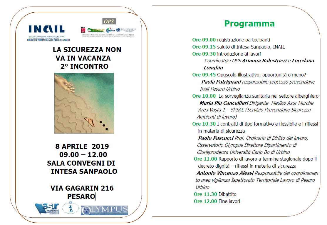 La sicurezza non va in vacanza è un progetto di prevenzione dell’INAIL Direzione Territoriale di Pesaro e Urbino e dall’OPS Organismo Paritetico Turismo e Commercio di Pesaro Urbino in collaborazione con l’Asur Marche Area Vasta 1, l’Ispettorato Territoriale del Lavoro e con l’ Osservatorio Olympus dell’Università di Urbino.